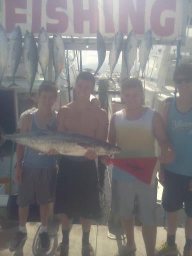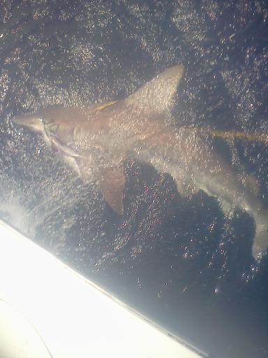 With plenty of fish in the fish box, it was time to go and find Jake's request for a Shark. I headed out to the Shark grounds in 400 ft. of water. We put out one surface Shark bait, one midrange Shark bait and one bottom Shark bait, while all the boys sat in the cockpit calling the fish, "Here fishy, fishy." With twenty minutes left in our fishing time, wondering if I should make a move and try another location, the bottom rod bent over!!!! Jake hopped into the fighting share to do battle with the unknown specie. Forty minutes later, the dorsal fin broke the surface belonging to a Bull Shark, estimated weight 225 lbs. Jake did a fantastic job bringing the Shark to the side of the boat, while pictures were taken, and the Shark was ultimately released to fight again.