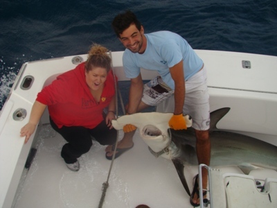 It only took about 2 seconds in the water and BAM he was all over it. So now we were Hooked Up with a sea monster that at first showed no signs of slowing down. Alicia Jumped in the chair and now the big battle began. It was a back and forth battle for a good 35 min till Matt decided to give his sister a little break. Since Matt was fresh and rested he got the fish coming our way. Once the fish got close enough for Luis to grab the leader we thought we've got this one. But then out of nowhere this fish got another burst of energy and ripped the leader out of Luis's hands and gray hounded away from the boat. Now I've got to say that in all my years of fishing I've never seen a hammer head shark jump.
