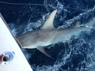 Yesterday the Lady Pamela II sportfishing boat turned up the heat on springtime sharkfishing, hooking up a huge hammerhead shark and a big bullshark in three hundred feet of water, offshore Fort Lauderdale. These bruisers could not resist the fresh bluefish, kingfish and bonito we were using for bait. When our anglers got the hammerhead behind the boat even the mate was awed. He said "Whoa! That is a big boy T-head there!" Those were some big words from a guy that has seen a lot of hammerheads. After some great pictures, and high-fives, this impressive fish was released.