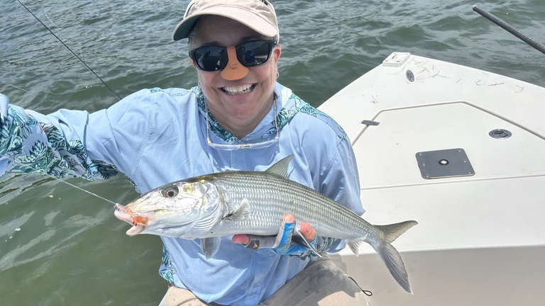Maria, she's awesome and she brought her super cool friend Joe along for a full day of fishing the flats on fly and spin. Maria had the fly rod and Joe had the spinning rod and we were targeting bonefish. Well, we had a great time and using shrimp Joe hooked and landed 4 bonefish on her first time bonefishing. Wow! Maria armed with the fly rod was really happy for Joe and as the weather started to get a bit sketchy it finally happened for Maria. Cast, strip, strip, strip, "I'm on!"... I love that! The bonefish got her into the backing 4 times before the solid 8 pounder came to the side of the boat for a release. Well, Maria was done and Joe was cool with it so we headed in early to avoid the coming weather and end on a high note.