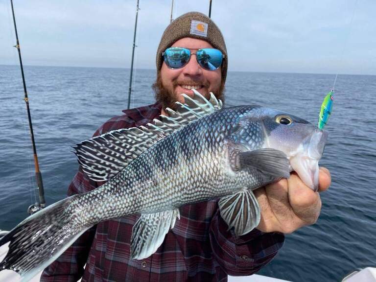 The Black Sea Bass have been biting well since January and there's still quite a few around to be caught. Wenever use bait for Bass or Snapper. We opt for 3 oz slow pitch jigs with no added weight. we also fish the bottom with DOA CAL Shad jigs rigged witha 3-oz egg weight carolina stylke with aroujnd 4 ft of flurocarbon leader and a large hook jig head. The DOA CAL will outfish squid or any other cut bait you can think of once you peg the proper jig color to match what the fish want. Usually darker colors with glitter and a paddle tail work best, whicj is why we choose the DOA CAL Shad Jig for this assignment. Thise big bass and Snapper will rip a curly tail jig to shreds before you can catch 2-3 fish.
