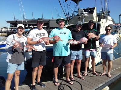 We had a short 4 hour trip today. Wow what stunning conditions, sunny skies, light wind and flat seas. Strange current direction again today but the water was nice and blue compared to green yesterday. It is chilly in the mornings but today warmed up quickly. Water temperature is dropping as we head into winter now. We trolled just over an hour on our way to the reef to see if we could get a nice Tuna but with no luck and with it being a short trip we got to our bottom grounds and dropped our baits using light spinning tackle. 1st drop and we had a tangle with 3 lines and one of the guys hooked up a nice Englishman and after that we got more nice bottoms with 30 fish in total that were size, all undersize fish being put back. We also had some Shark trouble and lost some fish, sinkers and traces and he made a big swirl behind the boat on the surface revealing his presence when he gobbled up an undersized Yellowbelly Rockod as we released it, whilst everyone was reeling up so we could move away from the Shark I saw some larger fish on the sounder just a few metres under the boat and as the lines came up we had a bunch of Yellowfin Tuna follow the baits right to the boat and then they were gone before we could even get time to drop a jig. Our catch for the day was Englishman, False Englishman, Soldier Bream and Slinger. After the bottom fishing we trolled some Rapalas back to port hoping for a Tuna but had no luck.