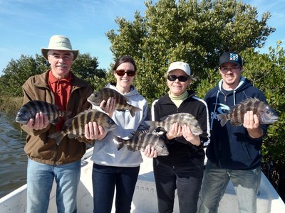 As awesome as the skinny water action is along the Nature Coast at the moment, the Sheepshead action along many of the oyster bars, rock flats, marker pilings and rocky holes is just as good. Sheepshead are probably one of the most tasty fish that swims and with huge schools of fish congregating around many local structures now is a prime time to target these prespawn hard fighting fish. Chumming an area that holds Sheepshead is a sure way to create a feeding frenzy. Chumming with shrimp, crabs, oysters, and even barnicles will surely entice most Sheepshead to bite as they do not let most meals go by at the moment. The trick when fishing for Sheepshead is to try and withstand the first few initial pecks of your bait. Often when these fish are pecking at your bait they are just taste testing it to make sure it's something they want to gorge on. Most of the time you will receive 4 or 5 small tap, tap type bites before the major bang bite occurs. This fishing is a ton of fun for kids and adults alike. It can be a little bit of a challenge but once you get the hang of it, these fish in Pinstripes will keep the entire family entertained.