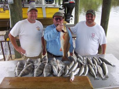May 3, 2006 - Troy Stanley and Ken from Denham made it down to Hopedale and were ready to go catch ‘em. The wind was up a bit but we made it outside only to find the trout hard to come by. We worked some birds then the rigs and islands then back to the birds. We could not get a steady bite going just a few here and there. Headed for the marsh and put some dead shrimp under corks looking for the redfish. We found the puppy drum eager to get in the boat along with one redfish. Some tough fishing today but we still had a great time.