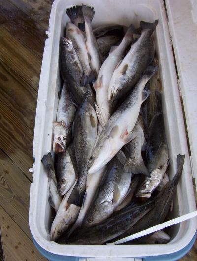 Skip Marks and son Phillip and daughter Alex got the perfect day yesterday. The last few trips with them it has been blowing but today the weather was perfect. I started out where I left the trout over the weekend but could not raise bite. Moved just a few miles to another rig in the area that usually produces and boy did it. It took about 10 minutes before we got the first bite and then things just turned on like wildfire and Skip,Alex, and Phillip were Smoking'em. Fishing live Campo shrimp 2 ft under corks the trout were slamming the baits like no tomorrow all 2 to 3 lb trout. These fish were really turned on and fighting super hard like fish twice there size. I was up and down the boat netting fish as fast as I could. It did not take long before the limit and 120 qt box was full. AWESOME ACTION! We headed to the marsh on the way in and made a few stops to get 4 redfish for skip to make his favorite dish Redfish Court-bouillon and headed in before the heat set in.