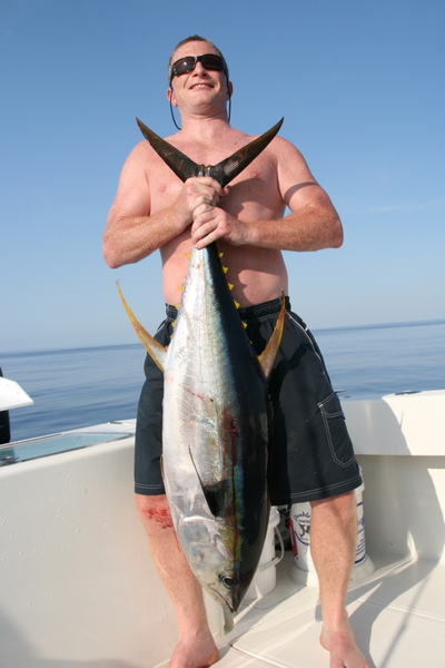 My trip to Bimini was great. I had a return customer who tuna fished with me in Andros, and he bought a few friends with him. Our trip started with a bit of apprehension. We had high winds and high seas all week due to Tropical Storm Debby and the forecast was not looking great early in the week. After blowing for over 6 days, the wind died down the day before our crossing and we had great weather during the entire trip. We ran across and cleared Customs and then checked in to the Bimini Big Game. After getting our rooms and dock, we ran to the Gingerbreads to catch some big yellowtails. As soon as we put our lines in we caught two flag yellowtails. After that we got sharked on every yellowtail we hooked. They were 200 to 300 pound bull sharks and were not shy of anything. After an hour of shark feeding we headed out into NW channel to look for the yellowfin tuna. The weather was great and made it easy to spot the flocks of birds on the radar and by eye. The first few flocks, we didn't see any tunas busting and we didn't get any tuna bites. Up in the tower looking I spotted a fin cutting across the surface. Going over to investigate, we saw a great big tiger shark. This fish was probably every bit of 600 pounds and showed no fear. We continued hunting for tuna and finally found a flock of birds with a few tuna busting. We set up and started with both live baits and chunk baits. The live baits got hit first followed by the chunks. We didn't catch a bunch of yellowfins, but the ones we did were nice fish in the 50 to 65 pound range. One of the neatest things I saw was when we threw a live bait out and the bait panicked and went down instead of out on the surface. The bait went down probably about 50 feet deep. The water in the Bahamas is crystal clear and you can see the bait swimming when all of a sudden here comes a 50 pound yellowfin, charges right at the bait and suddenly stops a mere few inches stops from the bait. It obviously saw something it didn't like and never ate the bait. It was very cool to watch though. The second day we went back to a different spot in the Gingerbreads and did well with the big flag yellowtails. The third day they had flights to catch so we left early and made the crossing and even had Kristen catch her first fish ever which was a nice 7 or 8 pound mahi.