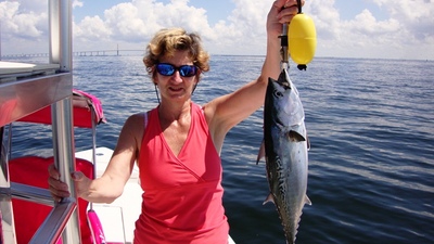 Next target was Mackerel on the way to my redfish hole. What we did find was schools of Bonita aka Little Tunny. If you have never caught one of these drag screaming speedsters you are missing out. On light tackle it's a blast. Typical Bonita runs 8-15 pounds and Saturday we had nothing but the bigger ones. Ripping silver jigs through the schools was almost a guaranteed hook up. As we would battle our fish the school would move off and once we released or fish we simply repositioned ourselves up current and drift back into the combat zone.