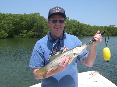 With most of the big snook on the gulf beaches it was no surprise the majority of the snook we took were 20-24". As the tide receded away from the mangroves the snook staged on sandy potholes adjacent to the mangroves. When this occurs I often will place a small float on the client's line to keep the white bait out of the grass. Whether we were fishing in the mangroves or the potholes chumming is important. Not only does it fire up the snook it shows you were they are. Look for jacks to be mixed in as will redfish.