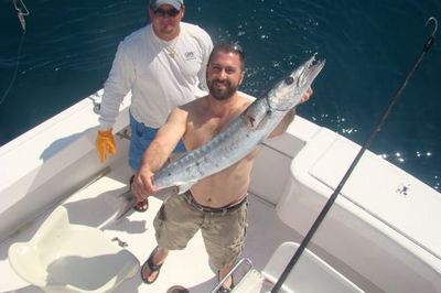 From there it only took a couple of min till the water exploded and we were Hooked Up. Lee grabbed the spinner rod and the fight was on. We had our hands full trying to drag this big fish away from the wreck but Lee hung in there and with in 3 to 5 min we were far enough away from the wreck where Lee just might have a shot at catching what ever it was on the other end of the line. After another 15 min finally Lee got his monster barracuda to the boat. We got the hooks out of him got a quick photo and released him to fight again another day.