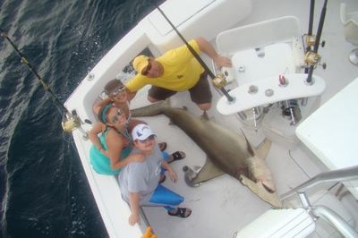 When this fish took off I mean he just screamed line off the reel like a fright train and @ times it seemed as if it would never slow down but soon enough he did and than Remo started to gain some line and than back off it went this back and forth went on for a good 45 min till at last Remo got his monster trophy 113 inch hammerhead shark to the boat.