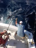 Andy purchased another dozen Goggle Eyes from Bud the baitman. I went directly to one of the artificial wrecks off of Ft. Lauderdale in South Florida noted to hold Sharks. We started off by putting out two kites and our Shark baits on the surface, mid range and bottom. As we were putting the second kite bait out, we immediately got attacked by Mahi Mahi's in the 5-10 lb. range. Only having one angler on the boat, Andy, we let the other Mahi Mahi hooked up until Andy was finished fighting the first one. After Andy reeled in all three Mahi Mahi's, I yelled out – "we can't Shark fish here because there are too many Mahi Mahi's" so we left the area – which goes against my golden rule – don't leave fish to find fish.