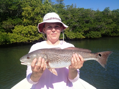 Redfish warmed back up to the water temperatures and we found a good bite most days this week. Our best day was with Ron, Mike and Timberly, when they boated six redfish and lost a few others. All are coming from both docks and mangroves. DOA shrimp or live bait has helped find some nice slot fish. We continue to catch the juvenile snook while fishing the mangroves. It great to see them come back from the freeze a few years ago. Nighttime anglers are landing some slot snook around the bridges and jetties on live bait, feather jigs and TerrorEyz. Trout have been on the flats in two to five feet of water. Kim Ann celebrated her birthday by boating the largest trout so far in 2013 at 30". DOA CAL jerk baits and Deadly Combos are great this time of year for trout fishing.