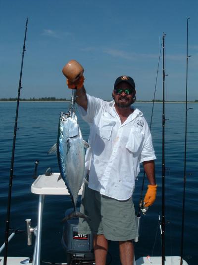 Capt Pat Wells showing off one of the many bonito that have invaded the inlets....