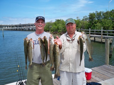 Steve Hughes and his fishing buddy, Ken, were down this way to do some trout fishing. We tried a couple spots before we found some trout willing to eat both live bait and artificials. Using DOA CAL 4" jerk baits, MirrOLures Mirrodines and DOA Deadly Combos, the guys limited out on nice trout with two above the 20" slot. In spite of windy conditions, the trout were on the flats. We caught trout around Harbor Branch, Queen's Cove and Round Island where we could manage the choppy waters.