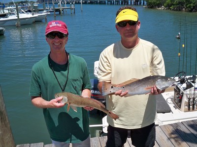 We found some redfish in small schools also this week on the flats. They were in one to two feet of water in the middle of the day. Keeping quiet and moving slowly can help out in finding some redfish that are willing to bite. Tom and Jim caught three and missed a couple others while fishing a DOA shrimp slowly along the flats. Tom even caught one while sight casting to one on the flats. The docks along Indian River Drive will hold redfish most of the summer.