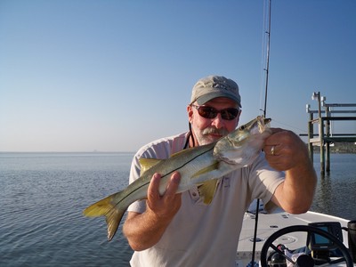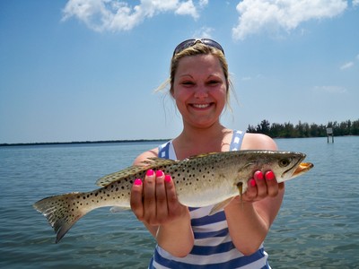 I managed a couple hours of scouting the river later this week and was joined by Gary, Steve and Sarah for an afternoon of fun fishing on the grass flats. They found a variety of fish biting including a few very nice trout for dinner. I found snook and redfish hanging around the docks south of Fort Pierce. On the grass flats, find the bait schools and the trout will be nearby. On the docks, I used a DOA shrimp in the new Arkansas Glow color. It's a great color. Both redfish, trout and snook will devour it. We used the Deadly Combo and live shrimp on the flats for mid-day trout fishing and had good success out there. Harbor Branch, Queen's Cove and the west shore south of Fort Pierce have all been good for trout. Mark Amorello reported having good success with a MirroDine around some of the Fort Pierce docks this week. Bernie emailed me a report of catching an early morning slam at Harbor Branch on top water lures recently. It's been great fishing weather out there!