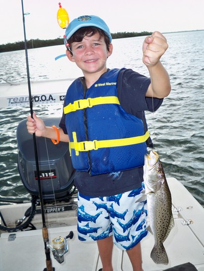 Eric, Alex, Tina and Etta joined me for the Michael Shields Memorial Fishing Tournament this past week. Alex is six years old and Etta is eight, so our plan was to let the kids have fun that day. Alex is an avid fisherman and was excited about fishing on the flats. We headed up to Bear Point to seek out some sea trout for him. We lost track of the trout that he and dad, Eric, caught that morning. No big takers, but lots of nice size slot trout. DOA Deadly Combos, CAL jerk baits and live shrimp kept the guys busy fishing all morning. Tina and daughter, Etta, joined us by mid morning and we found more trout willing to bite. Young Alex caught a nice redfish up on another flat, while Eric caught a snook from under the mangroves. We finished with five fish on our score card for the tournament, but the fun we had with Alex and Etta outweighed filling out the score card.