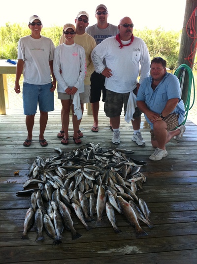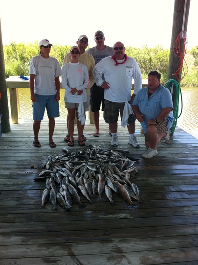 Today's fish count was 74 speckled trout and 1 lone red fish and 2 bay snappers and all of the were caught on live Campos shrimp rigged 3 feet under a popping cork. Also the off shore fishing has been phenomenal as of late and snapper bite has been retarded with so many snapper out there we have to move from rig to rif=g to try and get away from those hungry suckers and find other species that we can keep instead of having to throw the fish back and waste the bait.We also have a new 29 foot catamaran in our fleet that is great in rough seas so if you would like to make an off shore trip drop us a line or shoot us an email an lets go bend the big rods one time.