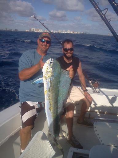 Our first couple of fish were Kingfish, both of them on plainers. From there I ventured off a little further to the east of Fort Lauderdale and found some scattered weeds in 280 ft. of water. I could see a couple of birds working the scattered weeds. We caught a Black Fin Tuna in this area. I kept trolling around, and a black shadow (Sailfish) appeared on the teaser. Mark, our mate, dropped back a Ballyhoo to the Sailfish which showed no interest and faded off. From there we ran across a floating piece of lumber where the Mahi Mahi's were hiding under. As I made my first tack past the lumber, a good size Mahi Mahi came charging the teaser and ripped off two of the Ballyhoos from the teaser. From there he made his mistake by eating the Ballyhoo from the rigger. One of the captains hopped into the chair to fight the Mahi Mahi; he brought the Mahi Mahi to the side of the boat and Mark gaffed the 16 lb. Cow Mahi Mahi and put it in the fish box. From there we kept trolling picking away at some Mahi Mahi's and throwing back the smaller ones. Total Mahi Mahi's caught was six.