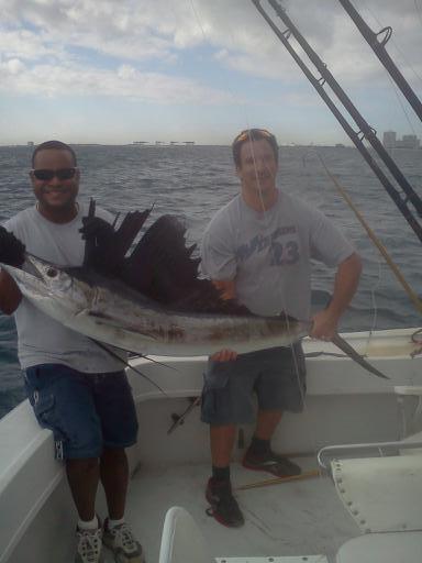 I trolled in and out of the drop off from 80 ft. out to 200 ft catching two Tunas and two Mahi Mahi's. From there I headed towards on of our 34 artificial wrecks located in Fort Lauderdale; this one was in 175 ft. of water. I put out one kite with two live Goggle Eyes and as I was letting out the second kite with one live bait on it, the black shadow appeared on the right short. Dorsal and bill came out of the water chasing the live Goggle Eye from the first kite frantically and he ate the bait. Hooked up!!! The Sailfish came immediately out of the water 100 ft. from the boat while the sun glistened down on his unique neon colors. The fight was on!!! Mark was our angler and twenty-five minutes later brought the Sailfish to the side of the boat for picture taking. Leslie looked up and said – "Nice fish but that should have been mine."