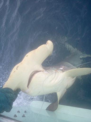 As the boys were sipping their beers and waiting for the dorsal fin to break the surface, the bottom bait rod bent over. We knew it was a Shark but the question was which type? One of the boys jumped into the fighting chair to do battle; thirty-five minutes later a Dusky Shark appeared by the side of the boat, as Mark, our mate, grabbed the leader; pictures were taken and the Shark was released to fight again. We set up again and waited and waited and waited – with no time left, it was time to bring in the lines. With two baits still out, the deep line bent over again and the fun was on. Another deep sea monster was at the end of the line. Todd jumped into the fighting chair to match his skills against the Shark and Todd and after a 45 minute battle won with an 8 ft. Golden Hammerhead Shark. Pictures were taken and the Shark was released.