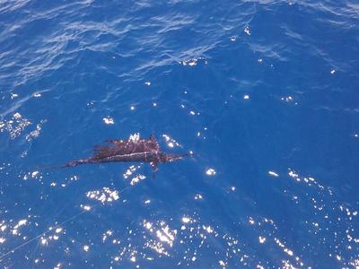 ach kite and one from the rigger. All four lines went down!!!! Bob and Carol took turns and brought in a total of 4 Bonitos. I was marking the bait fish over the wreck, and with fish around the wreck, you do not leave fish to find fish. We reset again, and then he made his appearance. A black shadow appeared on the right short bait with dorsal fin and bill ou