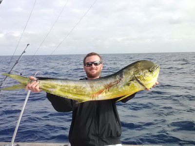 I could see some birds working off in the distance so I headed towards them. There were some scattered weeds, which I followed for about 1 mile and then found a board. Under the board we caught three Mahi Mahi's in the five lb. class and two Black Fin Tunas. As I kept trolling the scattered weeds, the right rigger came down and exited the line at a good rate of speed. Brian hopped into the fighting chair; immediately the fish came out of the water and showed his yellow and green colors – belonging to a big Mahi Mahi. Twenty-five minutes later, he brought the fish to the side of the boat where our mate, Vince, gaffed the Mahi Mahi and put it in the boat, weighing in at 29 lbs!!!!!