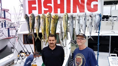 As we trolled the reefs in Fort Lauderdale, the two anglers took turns bringing in their catches, 4 Kingfish, a Bonito and a Black Fin Tuna. It was now time to do some live bait kite fishing so we set up two kites with two live Goggle Eyes from each kite in 230 ft. of water. The action started as the two angles had their hands full bringing in their catches, a total of nine Mahi-mahi's and 3 misses.
