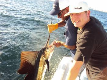 A black shadow appeared on the right short kite bait – Sailfish!!! Hooked Up!!! The Sailfish exited the water immediately tail-walking towards the boat. Barbara was our first angler and jumped into the fighting chair to subdue the Sailfish. After a ten-minute battle the Sailfish did not want to play anymore, and he threw the hook. We reset again over the same wreck. This time the right long kite bait was attacked by a Sailfish as his dorsal and bill came out of the water chasing the live Goggle Eye in circle. Finally, the Sailfish grabbed the bait and we were hooked up. Richard was our angler and he positioned himself in the fighting chair to enjoy his first Sailfish thrill. Twenty minutes later, Richard won the battle as Dave, our mate, brought the Sailfish to the side of the boat for picture taking and release.