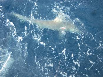 We reset again and this time the black shadow appeared on the left short kite - dorsal and bill out of the water chasing the live Goggle Eye frantically, finally capturing him – what a sight for the family to observe!!! Peter was our angler and he hopped into the fighting chair to do battle. The Sailfish came out of the water and tail-walked frantically, trying to dislodge the hook but with no success. Twenty-five minutes late, the Sailfish was caught, pictures were taken and the Sailfish was released. We reset for the third time – again the bottom rod bent over. Dash was our angler, positioned himself into the fighting chair and the battle was on. Forty minutes later, Dash brought the estimated 250 lbs. Bull Shark to the side of the boat – pictures were taken and the Shark was released to fight again.