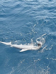I went out to 300 feet of water with a knot of north current in greenish blue water - it was the ideal condition. We set out two Kingfish heads and one Bonita. After about 30 minutes, we had a big one eating the Bonita. With the sound of the drag ripping off, we had a huge bite and the fish was on. The guys started fighting this fish and took turns on the battle. After this Shark took 4 big runs, these guys realized it was just getting started. The fight lasted for 45 minutes, and we had the Hammerhead Shark to the back of the boat. We carefully removed the hook and released this awesome fish.
