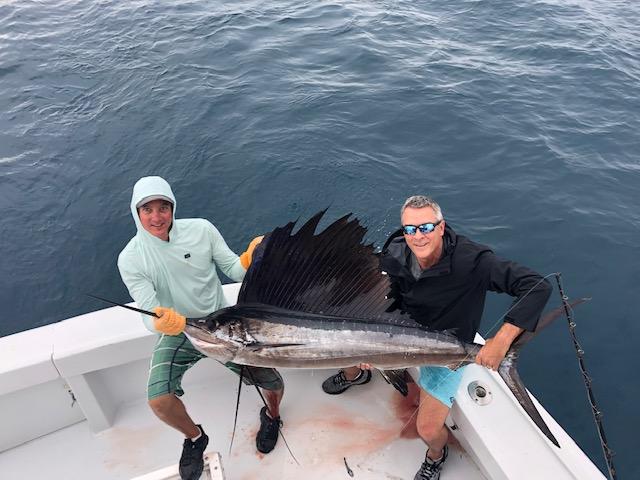 I found clean blue water over a good reef structure with plenty of live fliers and bait in the area. It was in 180 feet of water on the deeper side of the drop off. This is where we decided to start live Ballyhoo fishing. We set out 5 live baits and slowly trolled these baits. It didn’t take long before I saw the bill of a Sailfish out of the water trying to eat a bait. The first mate put the reel in free spool and fed the Sail, the line came tight and we had him on. Great show as the Sailfish jumped 5 to 6 times, each one higher than the last jump. The anglers did a great job bringing in the Sailfish, and after a good fight, they got the fish along the side of the boat. We removed the hooks, pulled the Sailfish in for a quick photo and released it.