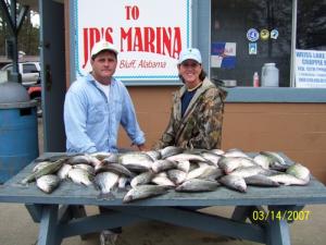Crappie fishing is Great. The Crappie are in the spawning bays of the upper lake in 3-8 feet of water. In the mid to lower lake the fish are in 6-10 feet of water in the bays. With the warm weather the males are starting to move to the banks in the mid to lower lake and a lot of fish are moving under the docks, shooting a Jiffy Jig in color JJ13 in1/24 ounce under docks is a sure way to load the boat with some Weiss Lake slabs. Trolling JIFFY JIGS in 1/24 ounce is producing some of the best fishing I have experienced in years, JJ13 and JJ17 and JJ25 are some hot colors right now. A lot of quality fish from 1 1/2 to 2 1/4 pounds are being caught with the average of about 12 inches long. The Chattooga River is also producing some fair catches using a Float and Fly technique and minnows 3 to 6 feet deep around the stumps on the edge of the old river channel. Target the river from the highway 68 bridge all the way to the bridge in Gaylesville.