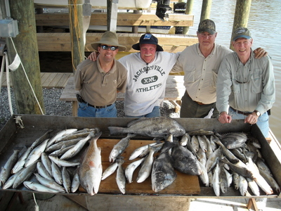 FINALLY, some good weather conditions light SE winds and warm temperatures. My guests today were Harry, David, Stan, and Dave from Hammond LA. Things started out great at our fist stop Corks down and drags screaming big redfish. One for the box and one Too big to keep just took some pictures and returned the 38" fish to the water. Hit a few more spots nothing the tide had stopped. We fish some dead bait on the bottom catching a few drums waiting for the tide to turn. Mid morning, the tide switched and the guy's were on the trout. Corks and titelined plastics we threw every color I had and they all caught. The bite was steady with all keeper speckled trout with some up to 3 lbs. It was beautiful day and we finished up with a box full of fish. GREAT DAY!