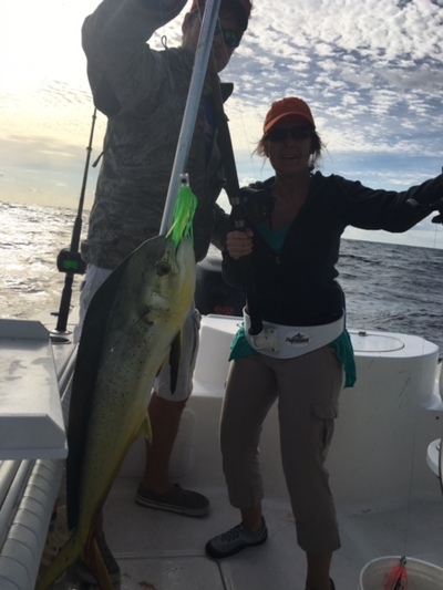 Ray and Jennifer were on a mission to catch their first dolphin Monday morning. After an hour and a half on the troll with no bites. I was feeling the pressure. Then finally the left long clip comes out. A nice gaffer jumps off. Ouch! Another hour passes….. Then two reels start screaming at the same time, dolphin double on the lines. Jackpot! Ray and Jennifer reel in their first dolphin at the same time in chaotic fashion. For the last couple hours of the morning we swung into the ledge for some bottom fishing and found some nice vermillion snapper and porgies.
