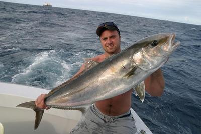 This morning we a had a boat load of anglers from all over the US. Hugo and his son visiting from Texas, Robert joined us from Virginia and Mark didn't have to drive too far, living right here in sunny South Florida. We needed live bait and we got some. We filled the well with a good amount of live speedos and bluerunners. We checked live bait off the list and ran 3 miles north to put the trolling gear out. Before we even had everything out, BAM! a dolphin ate. After we put the Mahi in the box both deep baits got hit with two gaffer size King Mackerels. We were on a roll now and we weren't stopping. We put the baits back out, catching a total of 5 nice size King Mackerels. Our anglers wanted to tug on something a little bigger so we headed to one of the several shipwrecks and made a drop. First drop of the day and we were hooked instantly. Whatever it was, it swam right into the wreck (not a good thing) and broke us off. Another big bluerunner went for a swim and we hooked a game fish immediately. Who knows, maybe it was the same fish looking for lunch. Bob jumped into the fighting chair ready to reel. After a 25 minute battle, Bob won and landed a beautiful Amberjack on his deep sea fishing trip. What a great way to end a South Florida vacation!