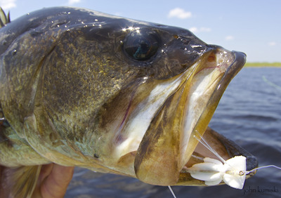 I saw a couple fish pop something on top, so I switched to a white gurgler. You know, gurglers are kind of stupid-looking flies, real easy to make. They work like crazy for everything. I got about a dozen bass to three pounds and three bluegills on this one before it was time to leave. Turned out to be a real nice day, even with the back problem.