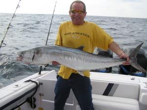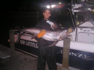 I had the priviledge of hosting Paul Fazio's clients on an excersion where we live baited large Pilchards all morning. The biggest fish slammed a line I set for a big Dolphin. We were drifting in 220 feet and coming in slow on a NE wind. I put a Pilchard on the deep rod that went 35 feet under the boat. Next thing you know that line gets hammered and line was ripping off the TLD 25 like it got snagged to a locomotive. Well over a 100 yards came off the spool. I kept looking out over the water to see the jump if it was a Dolphin. The fish never jumped but made a few more blistering runs making me think Wahoo. The fish finally makes it to the boat. I see a torpedo shape but I recognize the yellow in the tail of a mogan size Kingfish. So we put this fish in the box but not before we take a few pics. Just as we close the lid on the fish box the close surface bait gets nailed just as hard as the last fish hit. Now I know we found the big Kings. This fish hits the deck just a little smaller than the other.