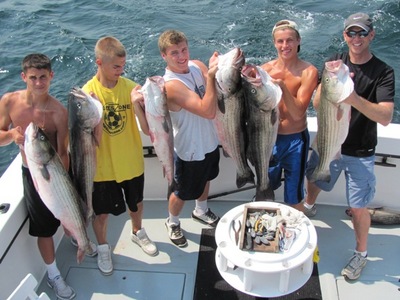 The captain says: Striped bass fishing is red hot right now. Fishing will continue to be good through September. Catching many stripers over 35 pounds.