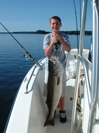 Then on Saturday it happened. It was a slow start only 5 fish in two hours, but then we hooked a good one. Had a rod with a heavy weight off to the side and line starts to move off the reel. We engaged the drag and line continued to move off the reel at the same speed. I knew instantly it was a big fish. Thirteen-year-old Mike was up on the rod and as he continued to work the fish it never stopped taking line. After the fish took 50 or so yards of line off the reel I knew it was time to take action, clear the lines, toss the anchor buoy and start the boat. There were a number of moorings behind the boat and I knew we would wrap one with all the line out, probably 100 yds. by now. I kept telling Mike and his Dad, "THIS IS A BIG FISH", I played this game before, no doubt about it. We backed the boat down on the mooring that the fish was now wrapped on, and Mike skillfully, took up the slack line and kept tension on the fish. We swung the boat around the mooring and freed the line and the real fight was back on. Mike had a tug of war with the fish for a few more minutes before we were straight up and down with it, only gaining a little line at a time. Net was extended, and ready, we see color, it is a monster, and in the net, barely. One, two three, in the boat. Mike lands a trophy 43" striper and on 20 lb test light tackle. The fish was fat and I estimate the fish weighed 32-34 lbs. This is the largest fish of the season for us, and one of the heaviest ever. What a day. We only got a few more fish after that but I hope Mike and his Dad remember this day for a long time. Guys spend their whole lives trying for a big fish and to get one at 13 is fantastic, what memories for Mike and his Dad.