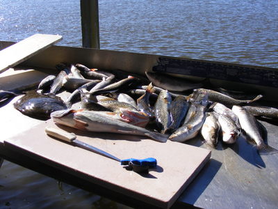 November was a super month for Trout/Reds.Water temperatures in the 60's proved to a real turn on for the fish.But,December is starting off even better with limits of fish being taken routinely.Without a doubt, the fish are biting the artificials better than the live bait.Four inch Saltwater Assassins rigged with a 1/4 ounce lead head seem to be ideal.Cast and retrieve slowly.The fish are taking a variety of color patterns,including the Woodpecker/New Penny/Pinfish/and Silver Mullet.If you have never fished artificials for Trout,your missing some great fun.You can also suspend these baits under a popping cork and have good success.