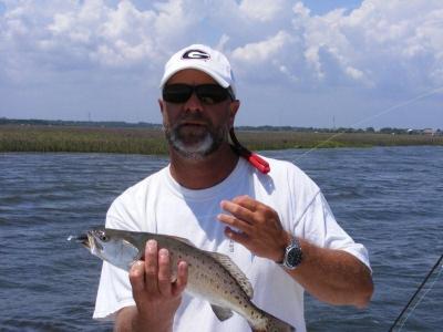 It was another beautiful weekend in the Golden Isles.Temperatures in the mid 80's with lots of sunshine.The water was nice and clear in most areas.However,the winds did muddy up some locations.Tides ranged from 5.7-6.6 in Ht.We fished the incoming tide both days.The Trout bite was good as long as you found water with good movement.We boated 45-50 fish over the 2 days,and were able to keep 22.There were some really nice roe Trout in the mix,which we released.We caught all of our fish on Saltwater Assassins-Glass Minnow/Silver Mullet.Most of the fish we caught were on shell rakes and points.