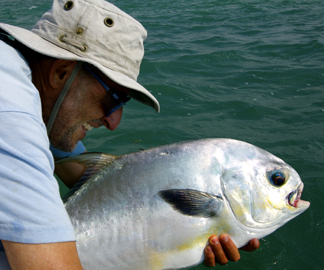 Maxx cranked up the motor and gave chase. I fought the fish for 20 minutes or so and finally tailed a handsome permit, around 15 pound or so. We took a few photos, then released the fish.