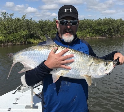 We are having a fun and busy summer of 2018 so far, wide variety of fish catching here in the Indian River and north Mosquito Lagoon backcountry. Landing Seatrout, Redfish, Snook, Black Drum, Mangrove Snapper, Whiting, Jack Crevalle, Ladyfish, and always some surprise catches on many trips, like Sharks, Pompano, Tarpon, and more. Usually catching 10 to 15 or more different species on most backcountry mixed bag trips. The back water area is full of life in the summer months, with surface striking fish in the morning hitting baitfish and shrimp, white water attacks making for fun sight fishing and catching. Loads of baitfish schools everywhere including mullet, pilchards, and menhaden are a summer fixture of food for game fish, dolphins, and birds. Water temperatures have reached the normal lower 80’ F levels, so careful handling of CPR ( catch photo release ) fish is needed as higher water temps means lower oxygen levels. Lots of teenage size “rolling” Tarpon are a frequent sight in our back waters, they are notorious for being super picky on biting a bait, but this 20 lb.( 39” ) Silver King had to have Alex from South Carolina’s live shrimp and stayed attached through the fight for a very quick photo before release………………
