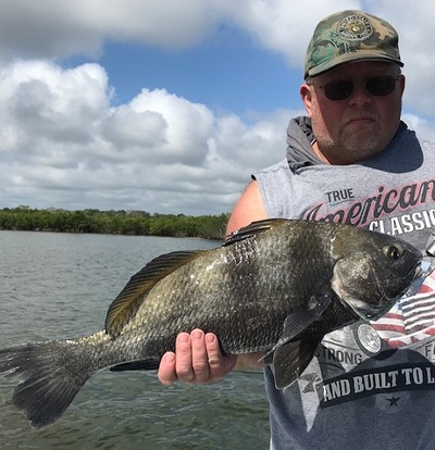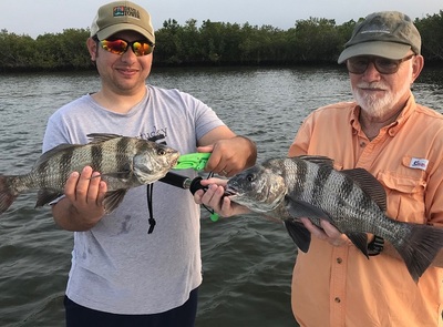 Black Drum continue to be a usual catch as they have all year, being a shellfish eater, they are quick to take our shrimp baits, most summer drum here in the north Indian River backcountry are school size of 1 to 5 lbs and roam along the bottom of holes and channels., repeat clients Andy and David from hooked up together from a school and landed these 2 Drum……