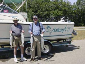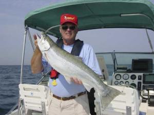 Speed was a factor and I was moving at 3.0 at the ball, and an equal number of fish were caught on both sides of the boat on many tight turns through out the morning. Early in the morning the salmon were caught near bottom on Dipsy Divers near bottom and latter in the morning the fish moved up and were caught 40-55 feet down on the Riggers and Lead core line. Now is the hour for all good fishermen to get out there as the fishing should only get better as the water warms.