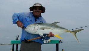 On the 27th of July, I hade the privilege to once again fish with Kent Roberts from Orlando, and our goal was to add tarpon to Kent's list. We met at Port Canaveral before sunrise, and we headed south down the beach in search of bait. Bait this past week was tough to locate, and we finally found a good concentration near Patrick AFB. After acquiring some pogies, we quickly located a large school of jumbo jack crevalle, and Kent was soon hooked up to a 30 plus pound school bus. While Kent was doing battle with the jack, a huge tarpon slammed a bait on the flat line off of the poling platform. I quickly switched rods with Kent, and his skirmish with the jack turned into a full-fledged war with the 120 plus pound silver king. For the next hour and forty-five minutes Kent fought the fish only to lose it boat side due to leader failure.