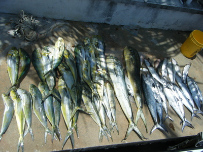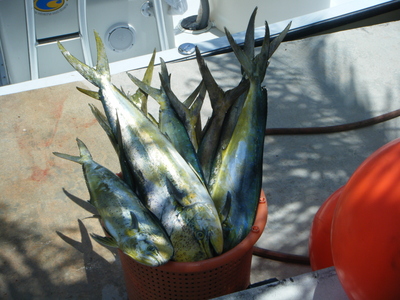The dolphin action has finally picked up again after many days of westerly winds that have pushed them farther out and shut off the bite.The fish are anywhere from 8 to 15 or so miles offshore mostly under birds or floating debris.Most of the fish are caught on live pilchards or threadfins and cut ballyhoo or bonito.Keep your 50-80lb. rod ready as you may run into blue marlin looking for a schoolie snack.We keep a 400lb.mono leader ready with a 16/0 circle hook with a 7/0 Mustad 9174 pinned to the bottom of thr circle hook to hook your dolphin in the upper jaw and fire him out there.There have been some small wahoo around the floaters with a #3 planer and a 60ft.piece of 80lb. mono with a #3-1/2 Drone spoon taking care of that.The kingfish have been biting good on the reef with the same live bait on 20lb. spinners with a 50ft.40lb.leader with a 4oz.lead attached via a floss loop and the lead with a snap swivel attached to it that you can add and remove without handlining the leader to the fish.We are open now so give us a call to book your charter.Check us out @ DeckTech Sportfishing.com.Tight lines