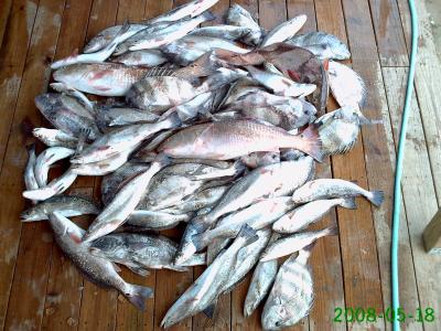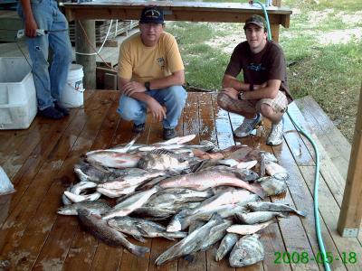 Sunday report from the Beach. Onboard for the day were Clifford Ward and his son Ross. The wind was blowing from the west, but not too bad as we headed out into the Sound. At out first stop things started off slow till the big Reds showed up. After releasing the biggest and keeping a couple of the smaller ones we moved on. Got to the next rig and got into a good but short bite on some very nice Trout with Bayou Chubs and live shrimp under a cork. Next stop was instant monster Reds so we moved on. By now the wind was picking up and made it tough to get in a good position at our next stop, but on the second try we got on top of them and it was a blast. Here we fished with live shrimp and Bayou chubs on a Carolina rig. Big Trout were coming to the net along with a bunch of Sheepshead. We also caught and released a 15" Red Snapper while catching the Trout. The fish box was cram packed with fish and we had a long rough boat ride into the wind ahead so we called it a day and left them biting. The guys had a great time and went home with a cooler full of fillets. Total take home for the day was 50 Trout (2-4 pounds), 17 Heads, 4 Reds, and 2 Drum.