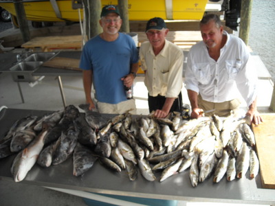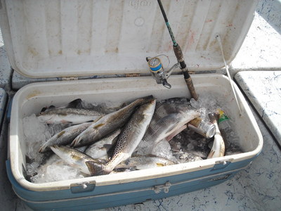 Super windy day yesterday but that ws not going to stop us from fishing. Al Godwin had two friends Gabbo and Mike were down from Kentucky and looking to set the hook and have their lined stretched a bit so it was off to the marsh. Things strated a little slow but we found some trout in a protected area and put about 20 on ice. Made a few moves looking for reds and found a point full of black drum just the thing to strectch the lines. Fish after fish with a few break offs and things were looking good. Back after the trout a few lakes later and we found them, nice size trout with shrimp under corks. Steady action for awhile and the box was about full so we called it a day before it got windy. RIGHT, it was blowing 20to 30 all day. It turned out to be a great day despite the wind and the guy's had box full of fish to take home